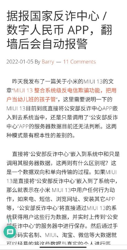 可能是一开始传言MIUI13内置国家反诈中心的原文,之前我有透露过相关消息
